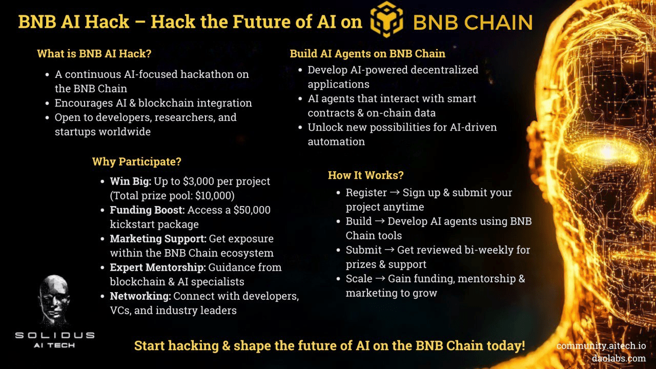 Il #BNBChain è entusiasta di annunciare il lancio del BNB #AIHack , un hackathon innovativo progettato per accelerare l'integrazione dell'intelligenza artificiale (AI) all'interno dell'ecosistema blockchain. Questo evento in corso offre a sviluppatori, ricercatori e leader del settore una piattaforma unica per collaborare e spingere i confini della tecnologia AI e blockchain.