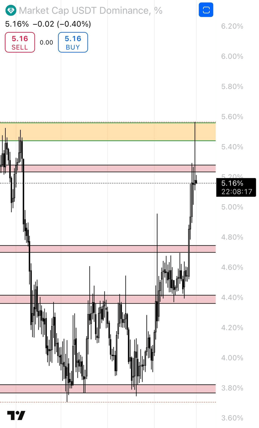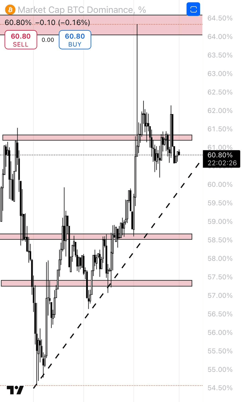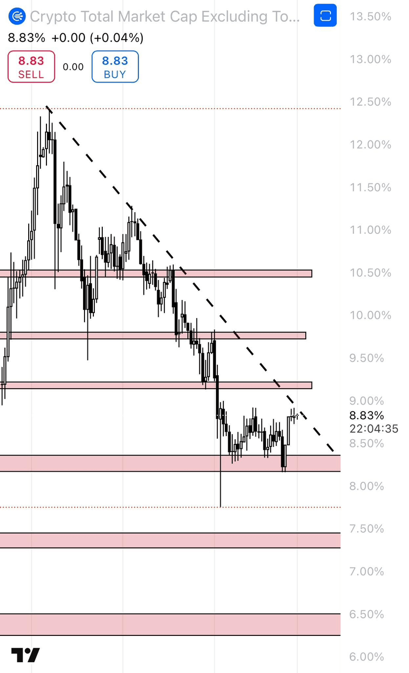 Ma ricorda che per essere rialzisti sugli Alts dobbiamo rompere la resistenza del 9,18%, superare la linea di tendenza al ribasso, creare un HL e poi un HH supportato dal volume; fino ad allora non toccare gli Alts a meno che tu non sia disposto a correre il rischio prima della conferma.