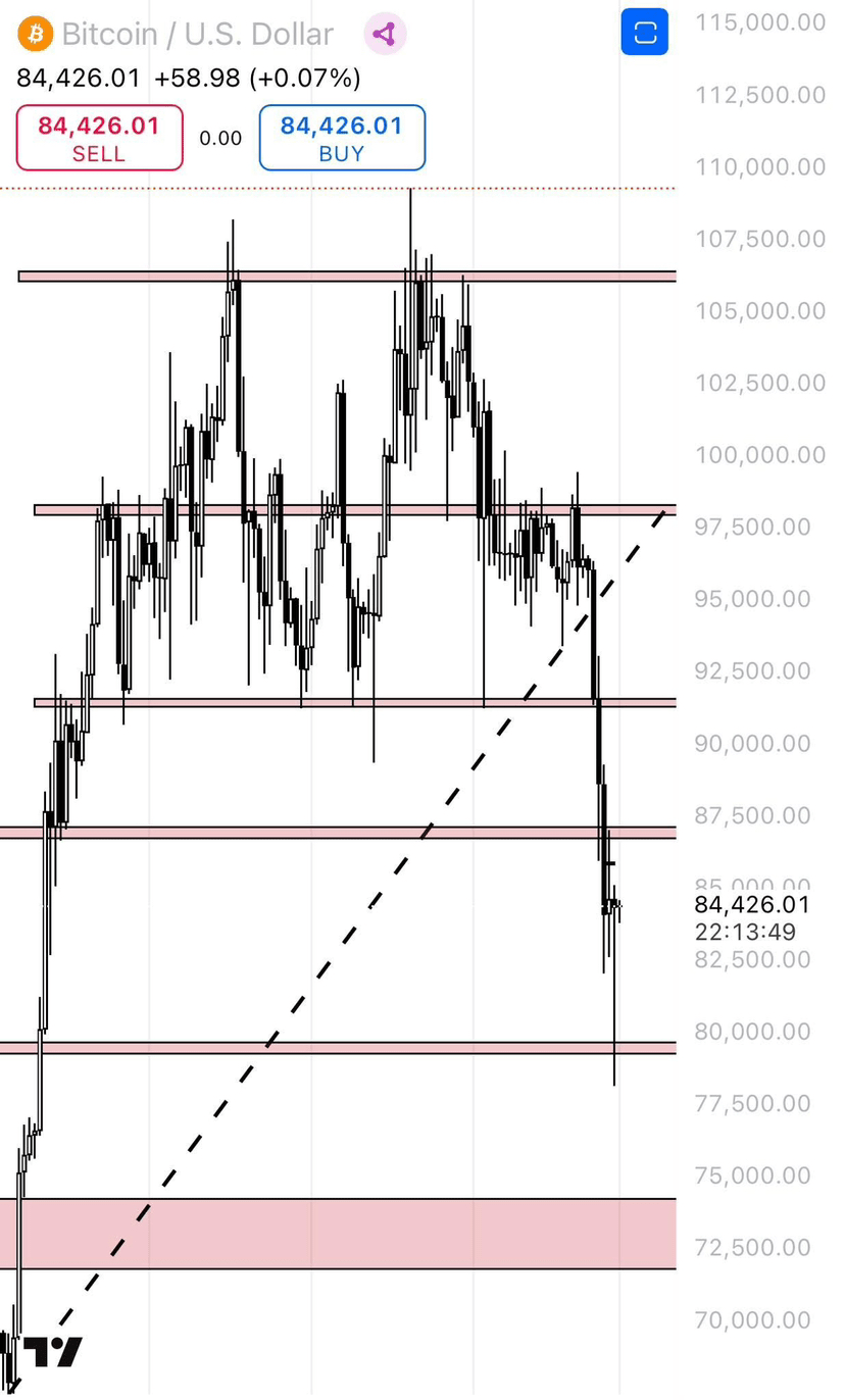 BTC ha ora cambiato la struttura del mercato e ora siamo in una tendenza al ribasso; come ho detto ieri, l'unico scenario rialzista era che questo fosse solo un ritracciamento per il prossimo movimento verso l'alto, ma ora dobbiamo rimbalzare a 79K, che รจ dove ci troviamo o 73K.
