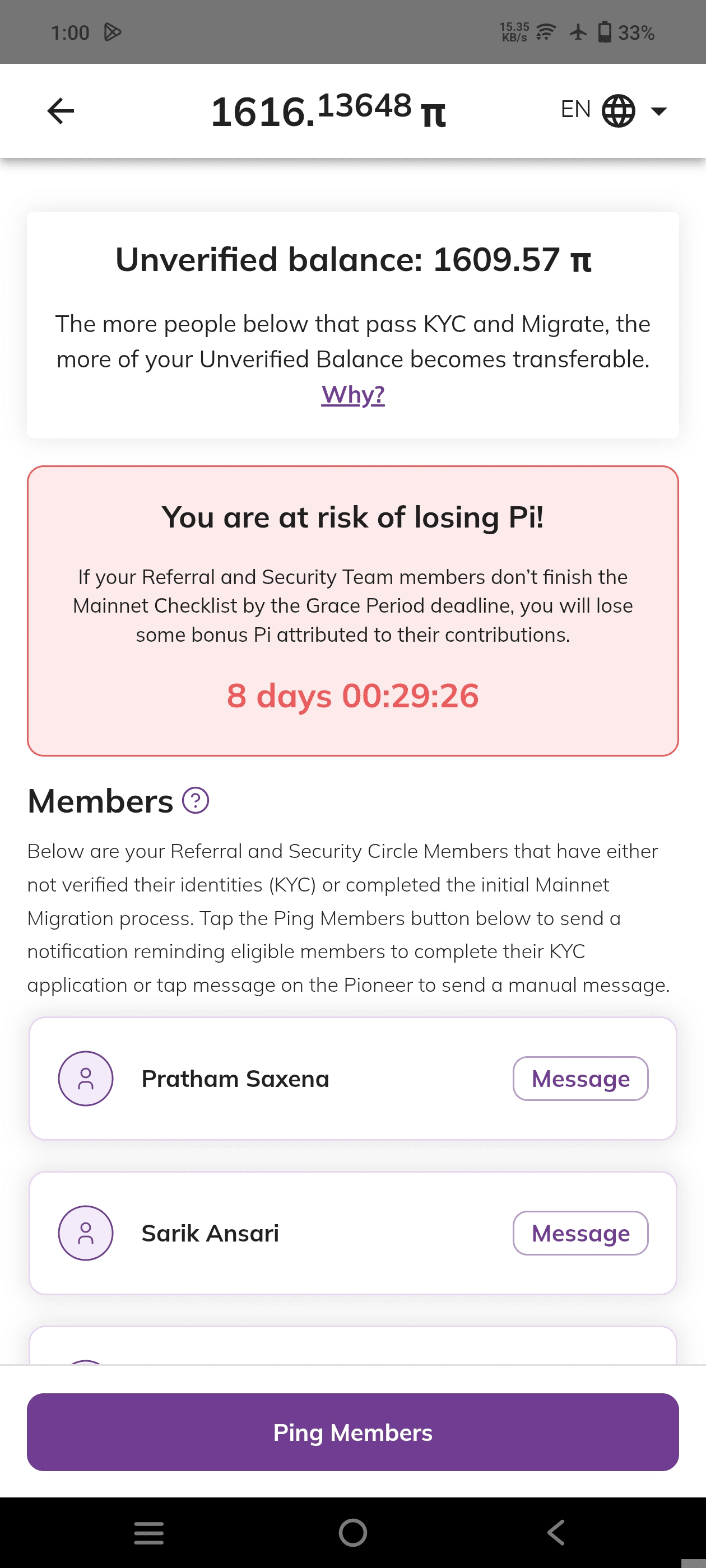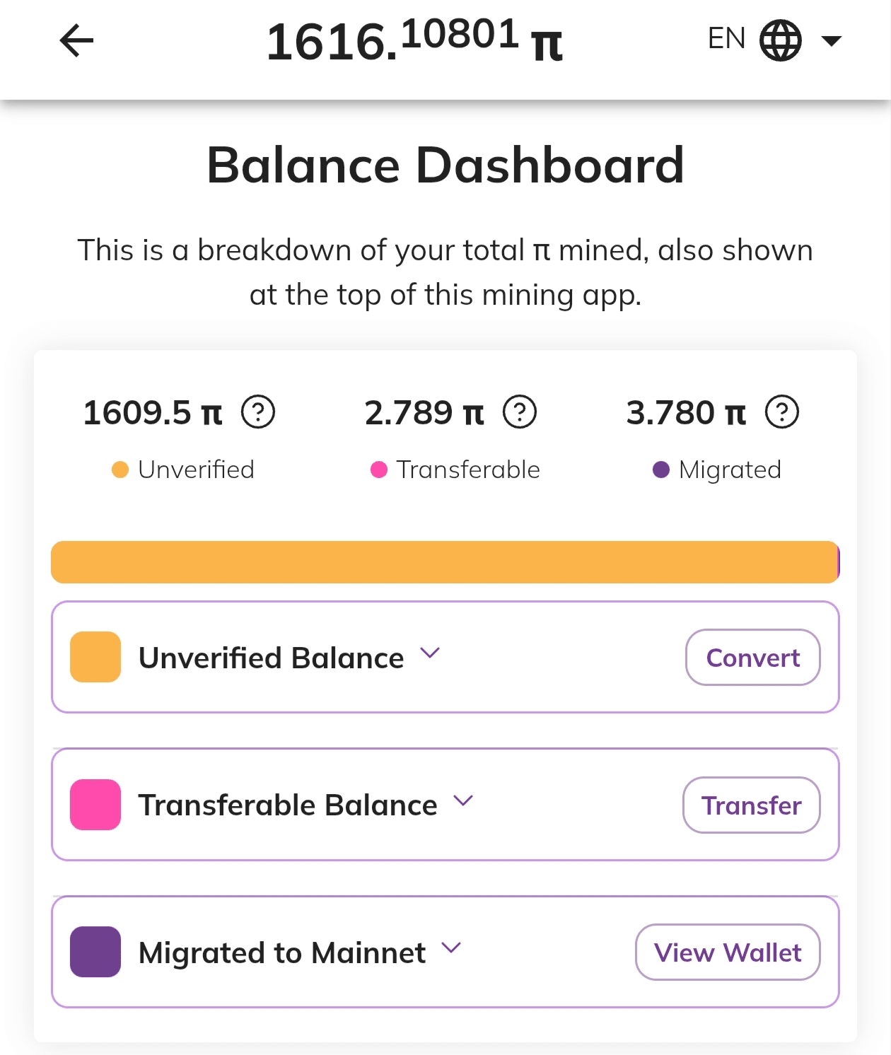 "Pi non verificato": Questa sezione consiste in tutti i bonus Pi che hai accumulato dai membri del tuo cerchio di sicurezza (sia KYC che non KYC), referenze (sia KYC che non KYC), bonus utilità e infine, il bonus nodo.