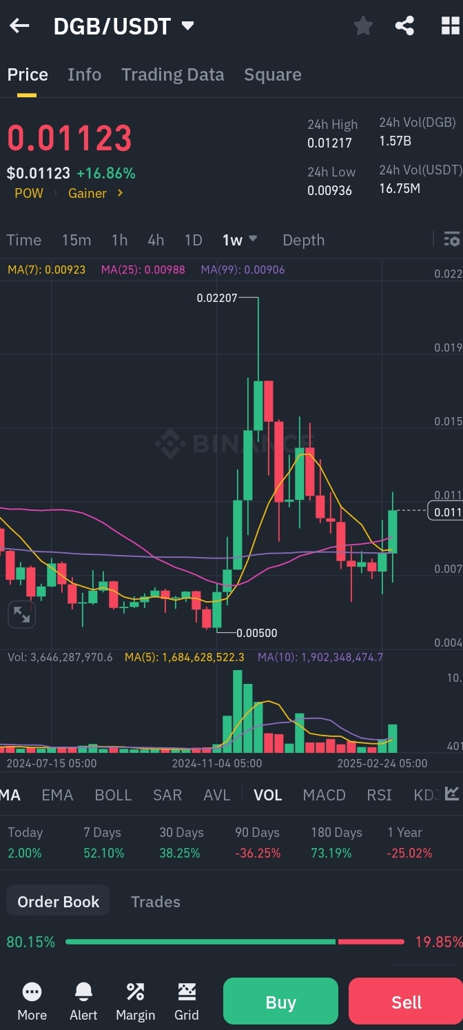 $DGB ha registrato un volume di scambi massiccio di 1.57B $DGB nelle ultime 24 ore, mostrando un aumento di interesse da parte dei trader. Lo slancio di acquisto è dell'80.15%, indicando un sentimento rialzista.