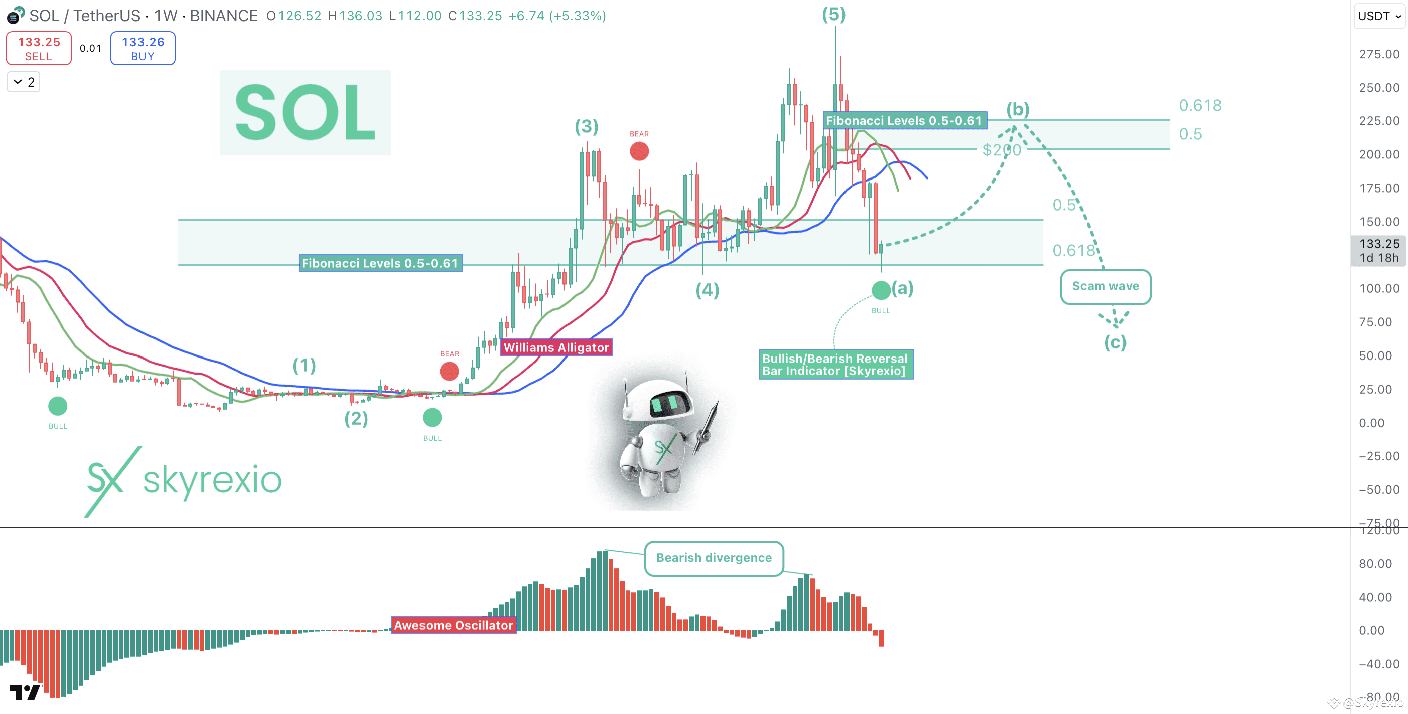 Diamo un'occhiata al timeframe settimanale. Qui possiamo vedere 5 onde di Elliott con la divergenza dell'Awesome Oscillator. Dopo di ciò è iniziata la correzione principale. L'onda A è stata completata a $110 con il punto verde all'indicatore di inversione rialzista/ribassista [Skyrexio] e ora vedremo l'onda B, che raggiungerà il Fibonacci 0.5 circa a $200. Da lì vedremo la caduta truffaldina nell'onda C. Probabilmente romperà il supporto principale di Fibonacci 0.61. In questo caso il gioco è finito e Solana può cadere per anni o anche truffare.