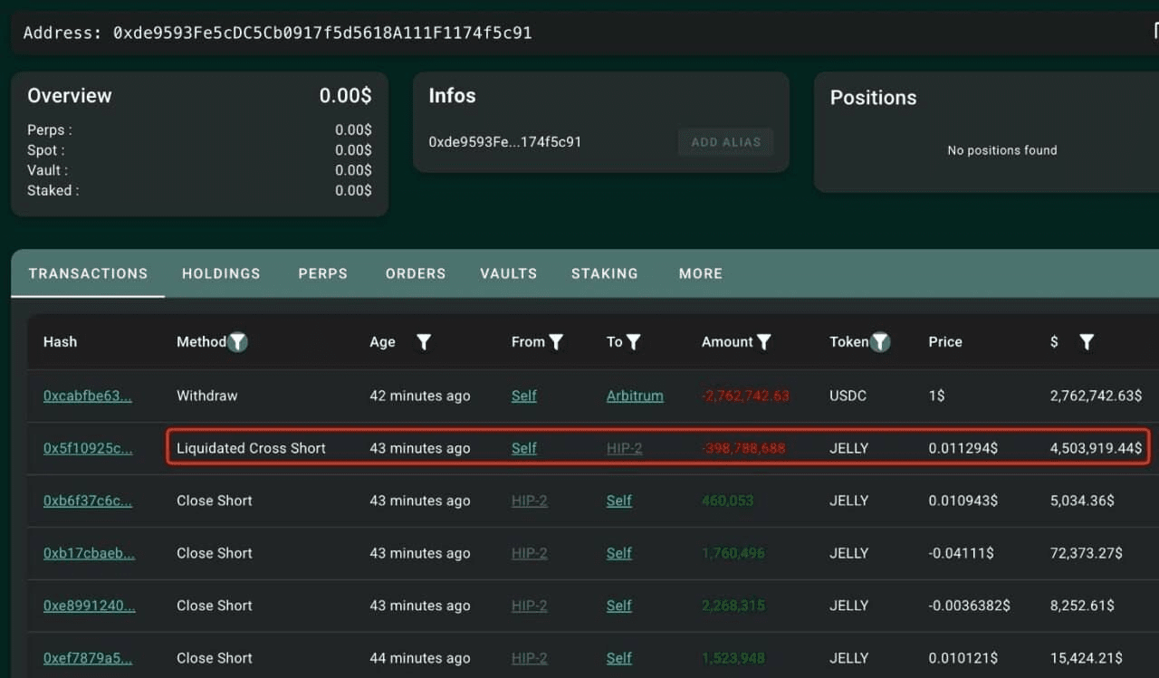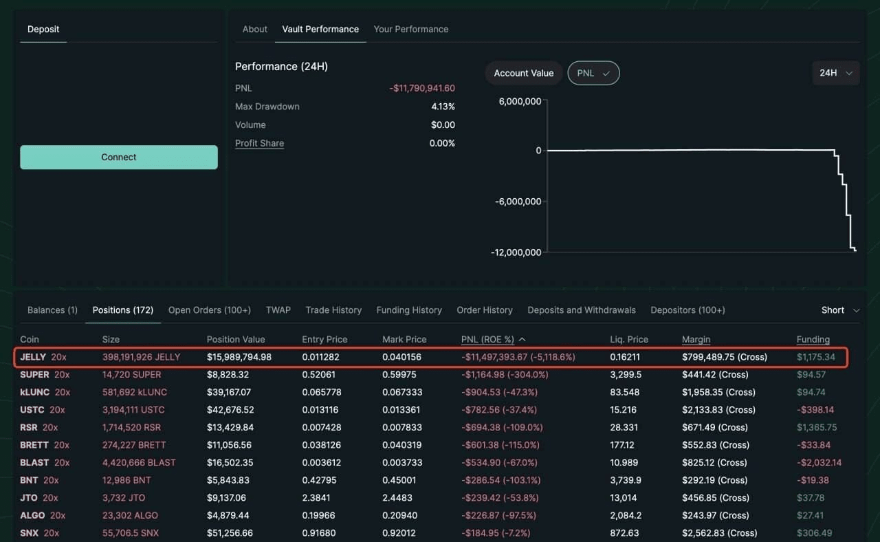 Hyperliquid, una piattaforma di futures perpetui DeFi, si è trovata in acque profonde dopo che una posizione short da $5M su Solana memecoin JellyJelly ($JELLY) è andata a vuoto a causa della liquidazione di un trader. Mentre il prezzo di $JELLY impennava—guidato da una squeeze short e dall'hype dei meme—le perdite non realizzate di Hyperliquid sono aumentate a $10,63M, con il suo vault da $230–240M a rischio se i prezzi toccano $0,17.