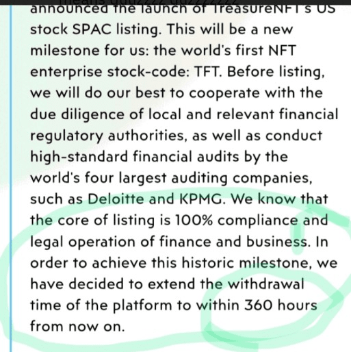 "Nessuno del team NFT ha condiviso alcun post riguardo al ritiro che è disabilitato per 360 ore. Questo significa che l'app NFT sta per scappare con i soldi degli utenti? Cosa ne pensi? Condividi la tua opinione nei commenti!"