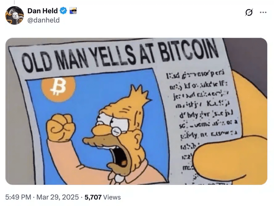 Il noto sostenitore di Bitcoin Dan Held ha anche partecipato alla conversazione, deridendo Schiff con un meme e suggerendo che le critiche costanti di Schiff hanno perso il loro impatto.