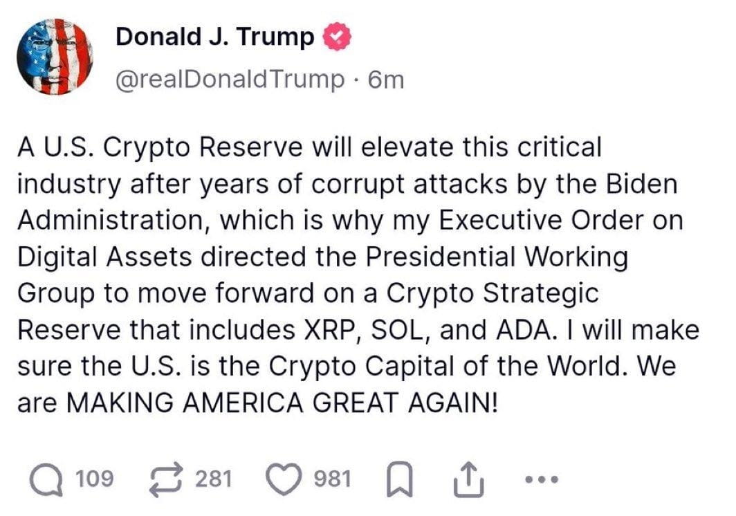—Trump sta spingendo per una Riserva Strategica Crypto 💼 che include XRP, SOL e ADA 🤯 — sì, le stesse monete che la maggior parte delle persone ha ignorato ultimamente.