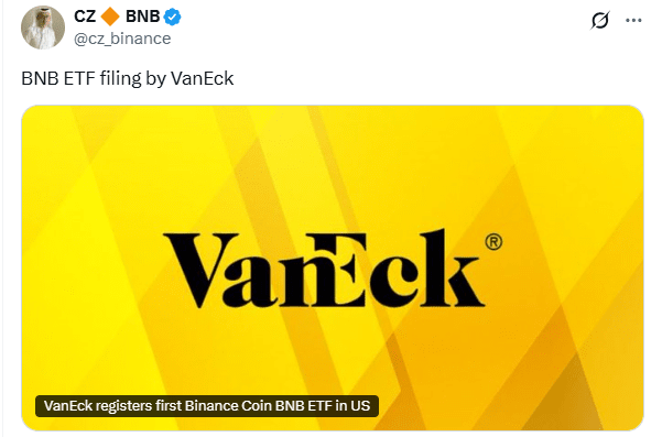 ✅ VanEck registra un ETF BNB nel Delaware, rendendolo il loro quinto deposito di ETF di asset crypto nello stato.