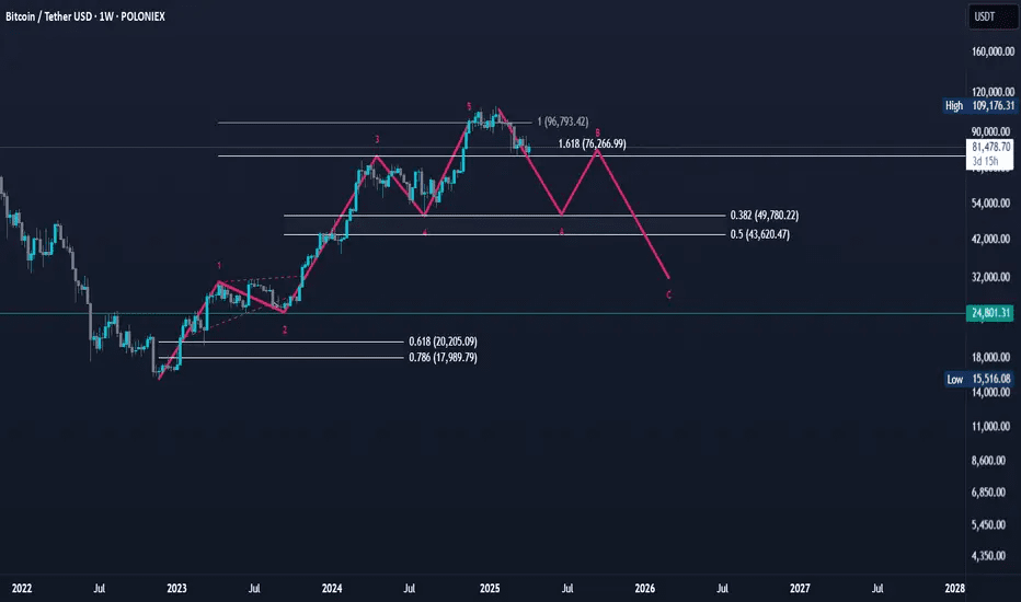 Bitcoin sta attualmente seguendo una classica struttura di Onde di Elliott, composta da cinque onde di impulso e tre onde correttive, etichettate come 1, 2, 3, 4, 5, A, B e C.