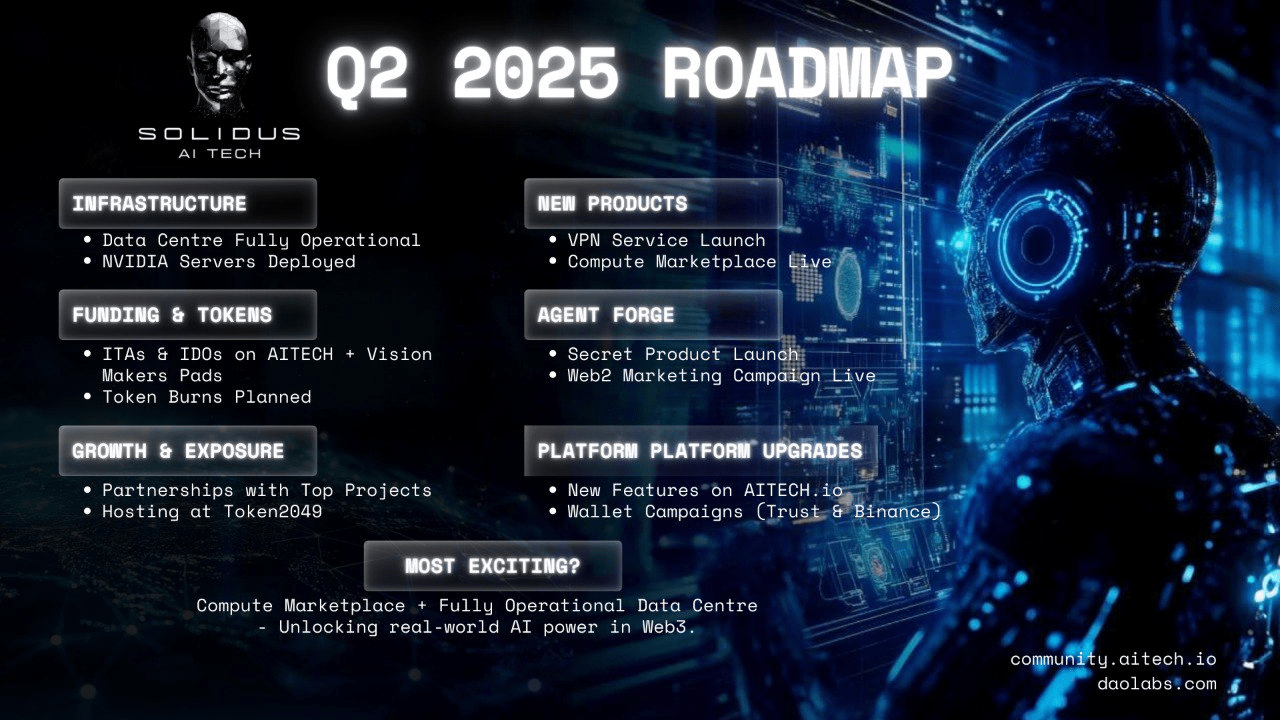Solidus @AITECH ha ufficialmente lanciato la sua Roadmap Q2 2025, ed è un segnale potente di ciò che verrà sia per l'industria #AI e #Web3 . Costruendo sul forte slancio del Q1, la roadmap delinea una strategia di espansione dinamica focalizzata sullo scaling dell'infrastruttura, sull'accelerazione del lancio dei prodotti e sulla creazione di partnership strategiche.