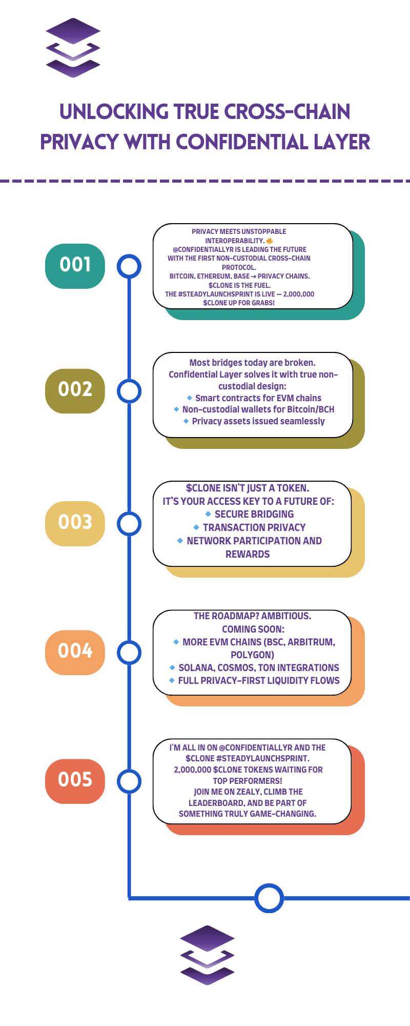 $CLONE, il token che alimenta questa intera rete, sta diventando uno degli asset più emozionanti nel settore. In questo momento, l’energia attorno al $CLONE Steady Launch Sprint è alle stelle. Con un montepremi di 2.000.000 di token $CLONE, Confidential Layer invita il mondo a partecipare, contribuire e crescere insieme a essa. Questa è più di una semplice #Zealy campagna: è un’opportunità per essere parte di qualcosa di rivoluzionario sin dall’inizio.