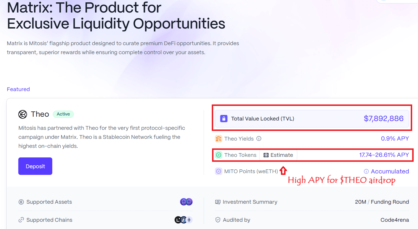 È interessante notare che il pannello Matrix Vaults fornisce una stima dei rendimenti dell'aereodinamica Theo, con un APY fino al 17.75-26.62%; l'APY è simulato tramite FDV.