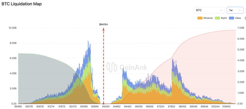 I dati della mappa di liquidazione di CoinAnk mostrano che, se BTC supera i 97.900 dollari, l'intensità di liquidazione accumulata degli short presso i CEX principali raggiungerà 4.389 milioni di dollari. Al contrario, se Bitcoin scende sotto i 89.480 dollari, l'intensità di liquidazione accumulata degli long presso i CEX principali raggiungerà 4.636 milioni di dollari.