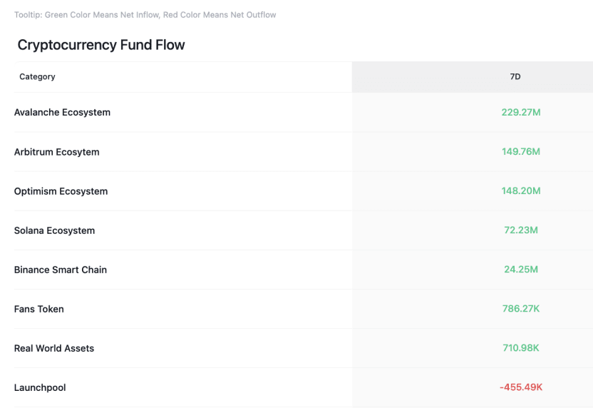 I dati di CoinAnk mostrano che nella scorsa settimana, il mercato delle criptovalute, suddiviso per settori concettuali, ha visto afflussi netti nei settori Avalanche, Arbitrum, Optimism, Solana, Binance Smart Contract, token dei fan e Real World Assets.