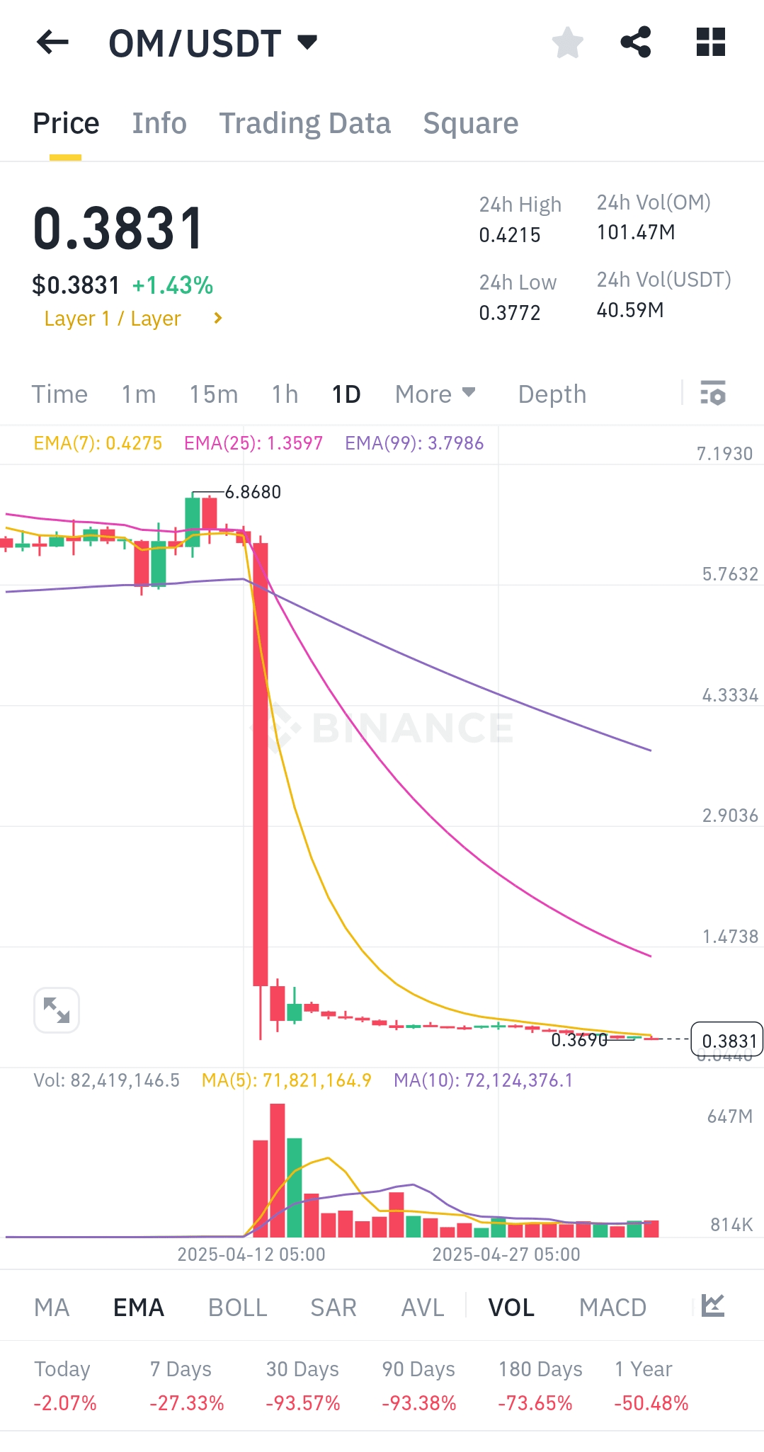 Ad aprile 2025, Mantra (OM) è passato da stella del breakout a sogni infranti, subendo un brutale crollo del 90% da $6.30 a $0.37. Miliardi di valore di mercato sono svaniti in pochi giorni, scatenando panico nella comunità crypto.
