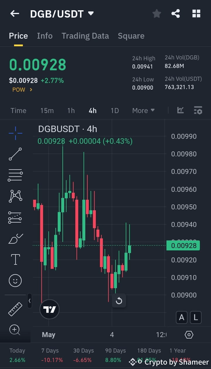 Osserva i modelli di rottura nel grafico a 4 ore e giornaliero. Cerca supporto attorno a livelli chiave come $0.008 e resistenza vicino a $0.012. Imposta sempre stop-loss e gestisci il tuo rischio in modo saggio.$DGB