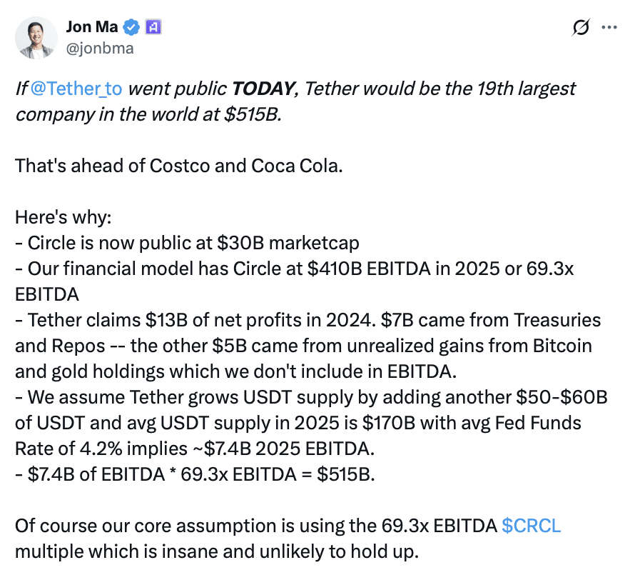 Ardoino ha affrontato la speculazione sulla valutazione sollevata dal CEO di Artmesis, Jon Ma, il quale ha affermato che se Tether, che è dietro la stablecoin $USDT, dovesse quotarsi in borsa, si classificherebbe come la 19ª azienda più grande a livello globale con una valutazione di 515.000 milioni di dollari, superiore a giganti multinazionali come Costco e Coca-Cola.