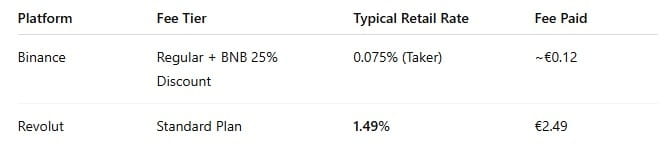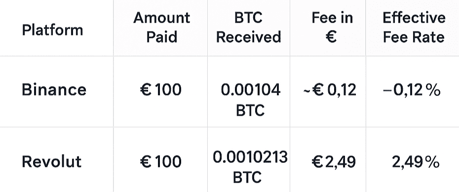 Revolut mi ha dato meno BTC per gli stessi soldi, e la commissione era ~20 volte superiore a quella scontata di Binance.