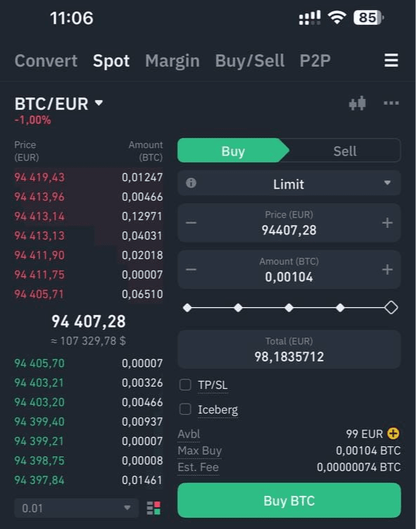 🔹 Saldo Binance: €99,00 (dopo una commissione SEPA di 1€) 👆
