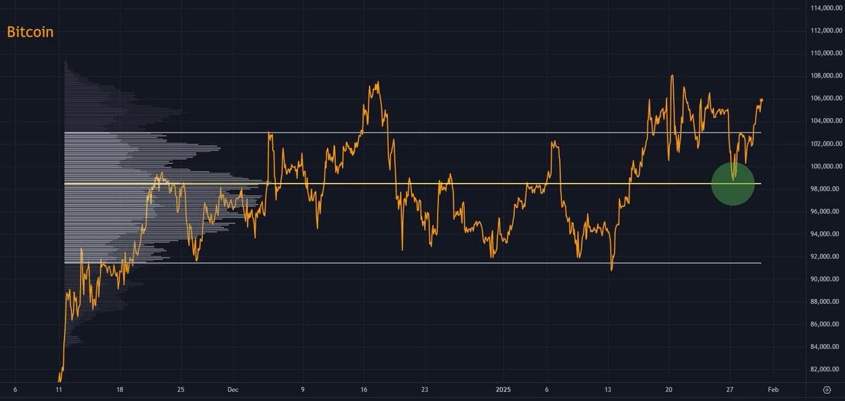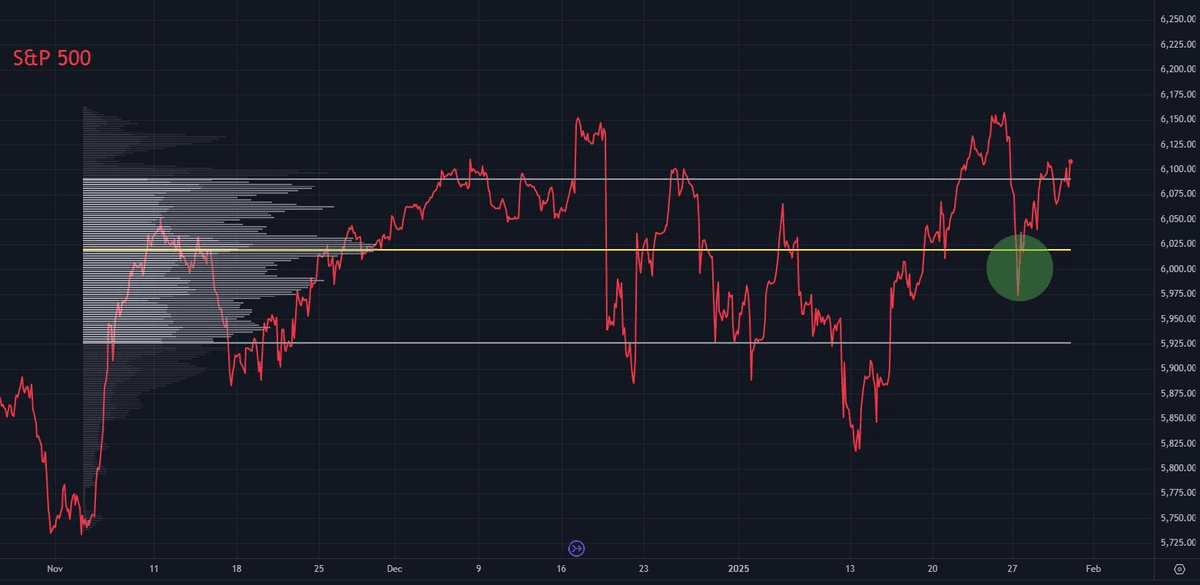 Sia l'S&P 500 che il bitcoin hanno ripetutamente testato il Punto di Controllo dell'intervallo (🟡) e sono rimbalzati fortemente fuori dall'Area di Valore dell'intervallo (segno di forza).