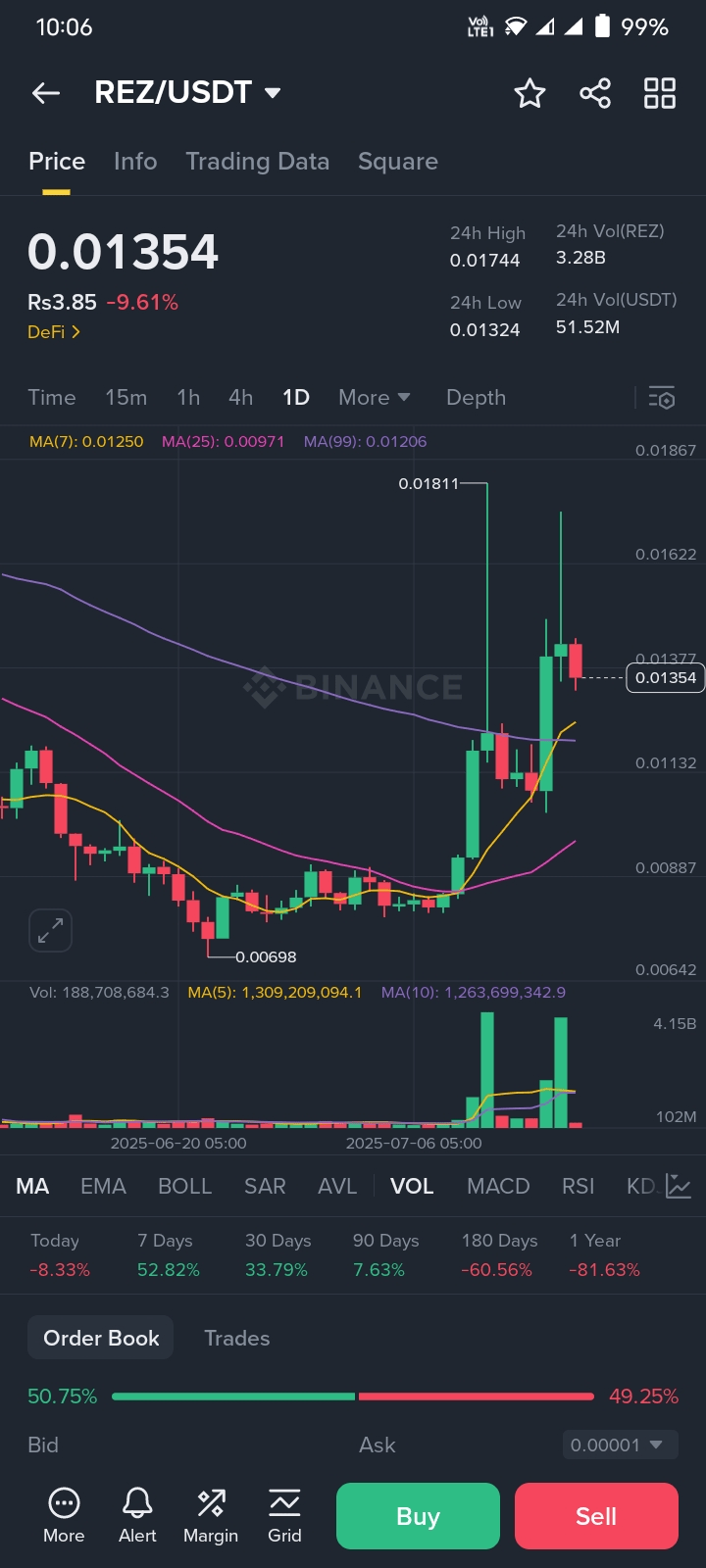 $REZ è sceso di circa lo 0,1% oggi, scambiando intorno a $0,01354. Tuttavia, rimane in aumento di quasi il 40% rispetto al suo prezzo di una settimana fa, che era nella fascia di ~$0,009–0,010.