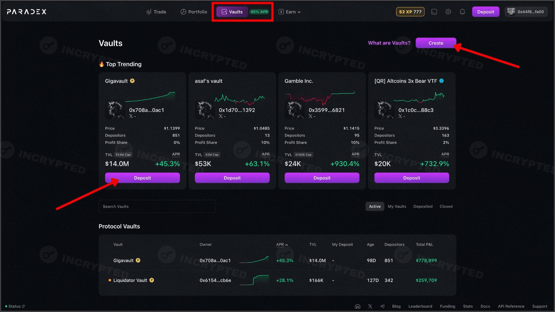 Oltre al trading, gli utenti hanno la possibilità di fornire i propri fondi ad altri trader o direttamente a Paradex per sostenere la liquidità. Per questo si possono guadagnare APR e punti. Per farlo, andiamo alla scheda Vaults, scegliamo un pool o creiamo il nostro e depositiamo i fondi: