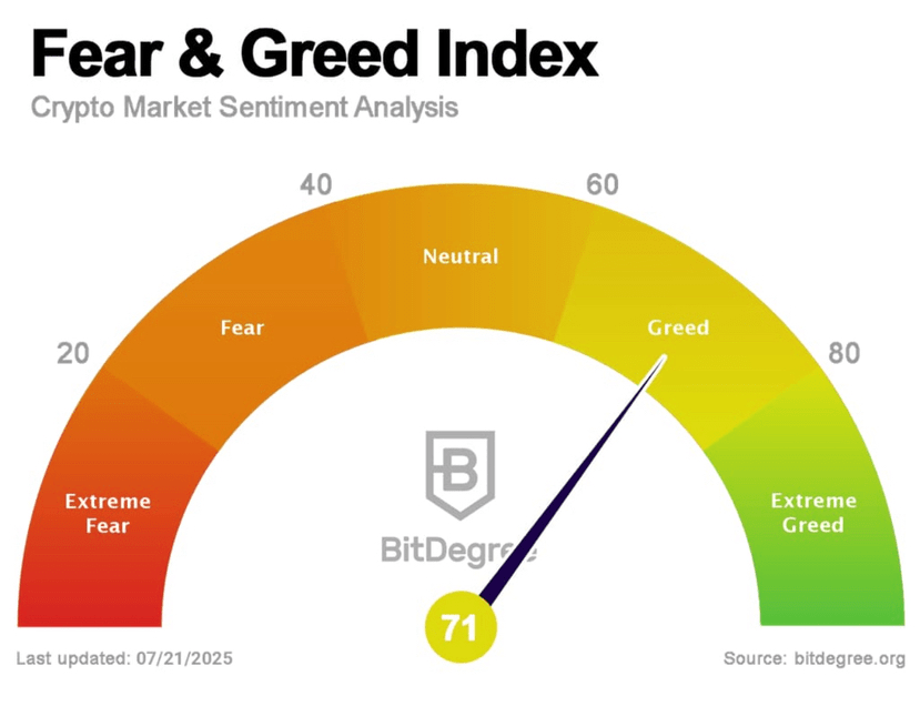 🧠 Indice di Sentiment: 71 (Avidità) → rialzista ma surriscaldato