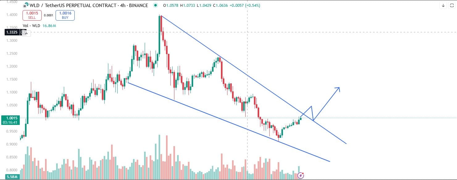 WLD/USDT ci mostra un pattern a cuneo discendente. Fornendo un segnale di inversione rialzista. Speriamo che il prezzo superi la linea di resistenza del cuneo. Così possiamo vedere alcune candele verdi. Il volume sta aumentando gradualmente, supportando il breakout. Possiamo anche vedere un test di resistenza.