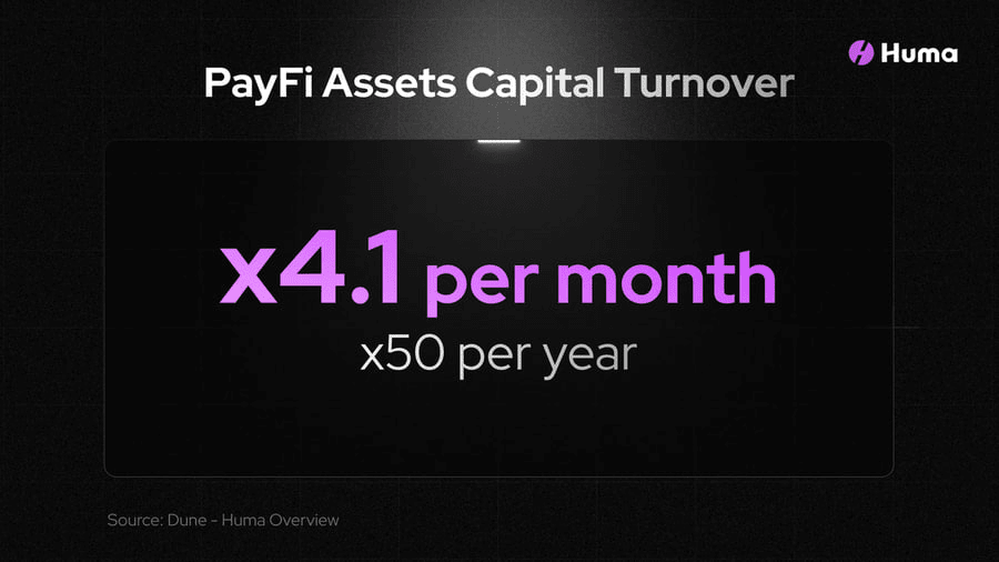 Nel settore finanziario tradizionale, un tasso di rotazione annuale del fondo può arrivare a 5-10 volte per essere considerato efficiente. Eppure, il tasso di rotazione del capitale del protocollo Huma si avvicina a 50 volte, il che significa che 1 dollaro di liquidità può generare 50 dollari di volume di pagamento in un anno.