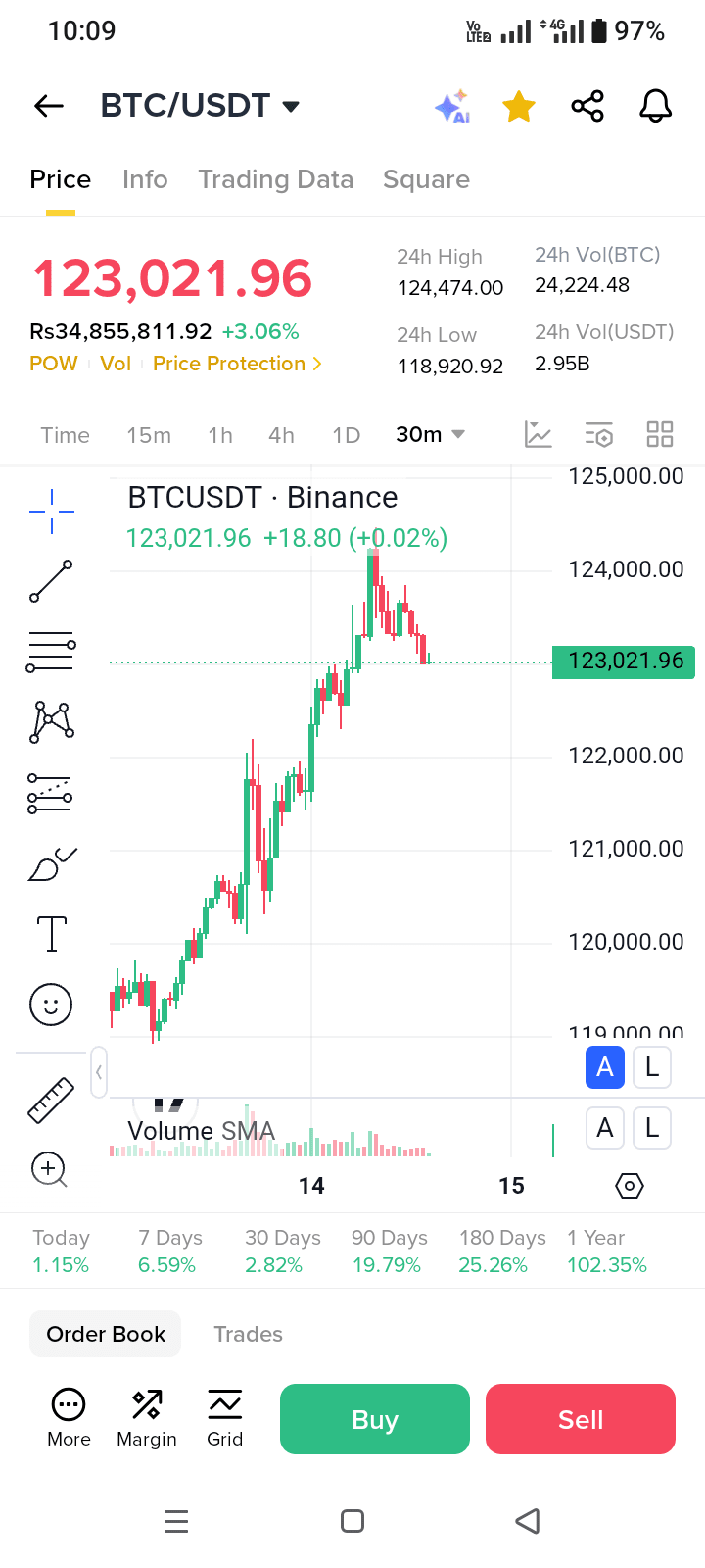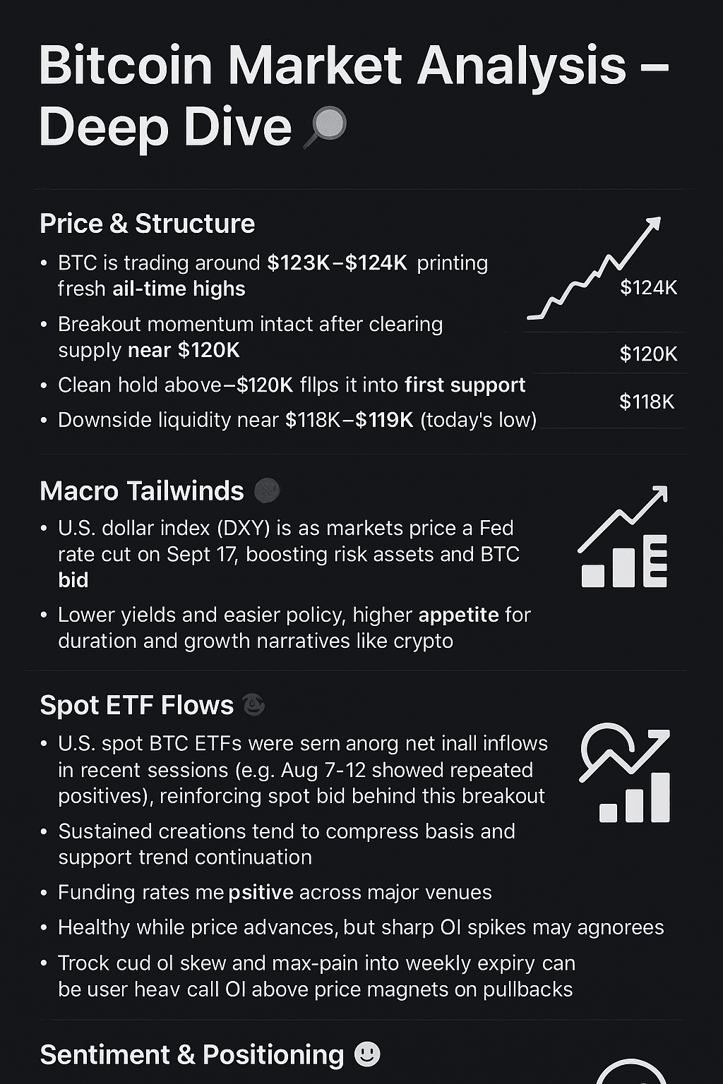 Il BTC sta negoziando intorno a $123K–$124K, registrando nuovi massimi storici oggi. Il momento di breakout rimane intatto dopo aver superato l'offerta vicino a $120K. Un mantenimento pulito sopra ~$120K lo ribalta in primo supporto; la liquidità al ribasso si trova vicino a ~$118K–$119K (il minimo di oggi).