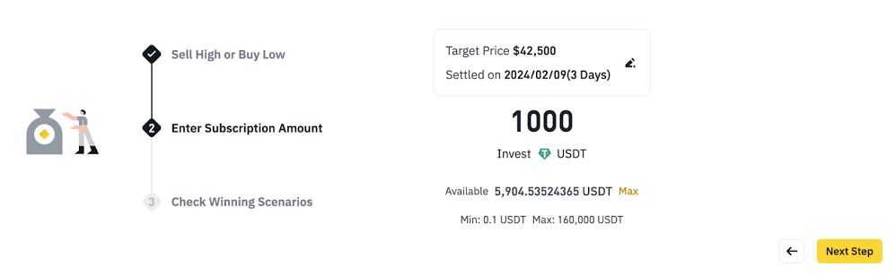 Stai bloccando una certa somma (in una valuta specifica, come BTC o USDT) per un periodo di tempo (data di regolamento), stabilendo un prezzo obiettivo (Target Price).