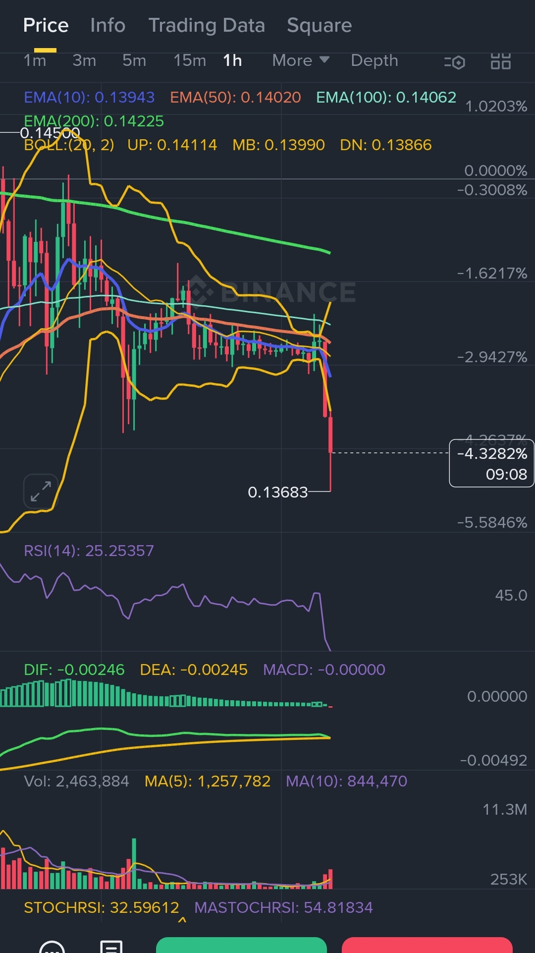 - **Bollinger Bands (20,2):** Prezzo abbraccia la BANDA INFERIORE (0.13748). Compressione in arrivo!