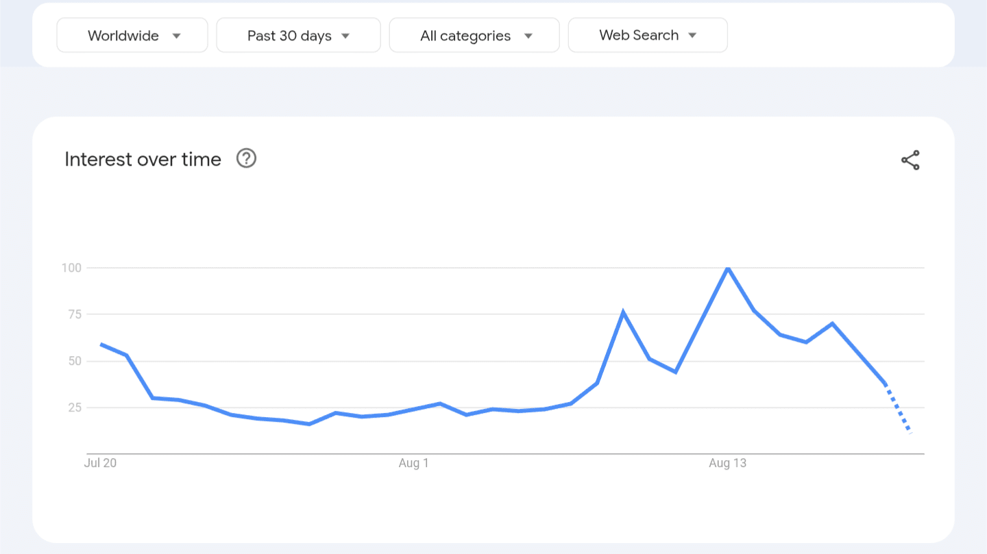 L'interesse pubblico per l'Altseason è crollato di oltre il 55% in appena una settimana, secondo i nuovi dati di Google Trends. I punteggi di ricerca per il termine sono scesi da 100 il 13 agosto a quasi 45 entro il 20 agosto, con alcuni tracker che mostrano un calo ancora più ripido a 18 a livello globale.