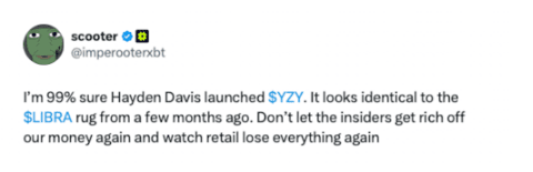 Un KOL ha rivelato che Hayden Davis, che aveva emesso la "moneta del presidente argentino" Libra, ha partecipato anche a questa YZY.