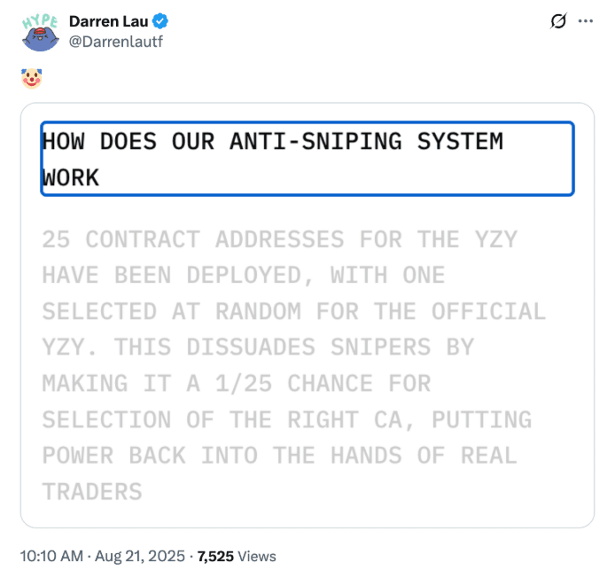 Secondo il sito ufficiale di YZY Money, per evitare "attacchi speculativi", il team ha impostato 25 indirizzi di contratto e ne selezionerà uno casualmente come indirizzo di certificazione finale, riducendo la probabilità di indovinare l'indirizzo corretto in anticipo al 4%.