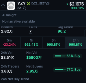 Appena la notizia è uscita, il mercato è impazzito, gli indirizzi di detenzione di YZY sono schizzati a 28.200 in soli quaranta minuti, e il prezzo è salito istantaneamente a 3,43 dollari. Ma la buona sorte non è durata a lungo, è tornato a 1,8 dollari in mezz'ora.