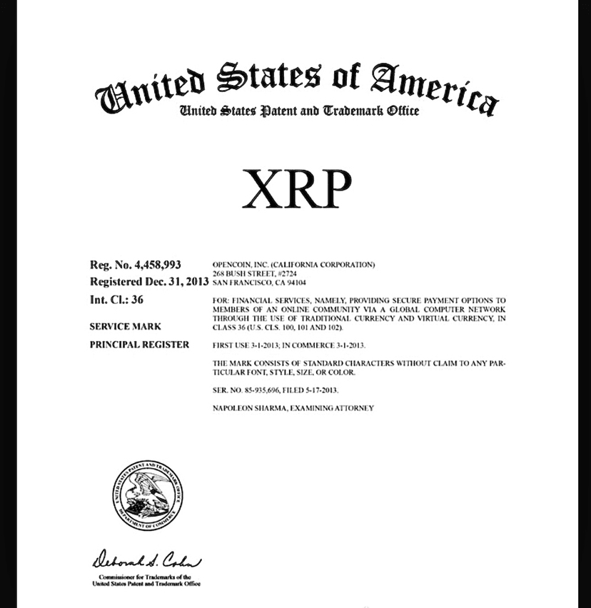 A prima vista, il design del certificato conferisce peso a tale interpretazione. Ma uno sguardo più attento rivela una storia diversa. Il documento è autentico, ma non rappresenta un brevetto governativo, né alcuna dichiarazione di XRP come valuta supportata dallo stato. Invece, riflette una registrazione di marchio depositata da Ripple nei suoi primi giorni, quando l'azienda operava sotto il nome di OpenCoin.