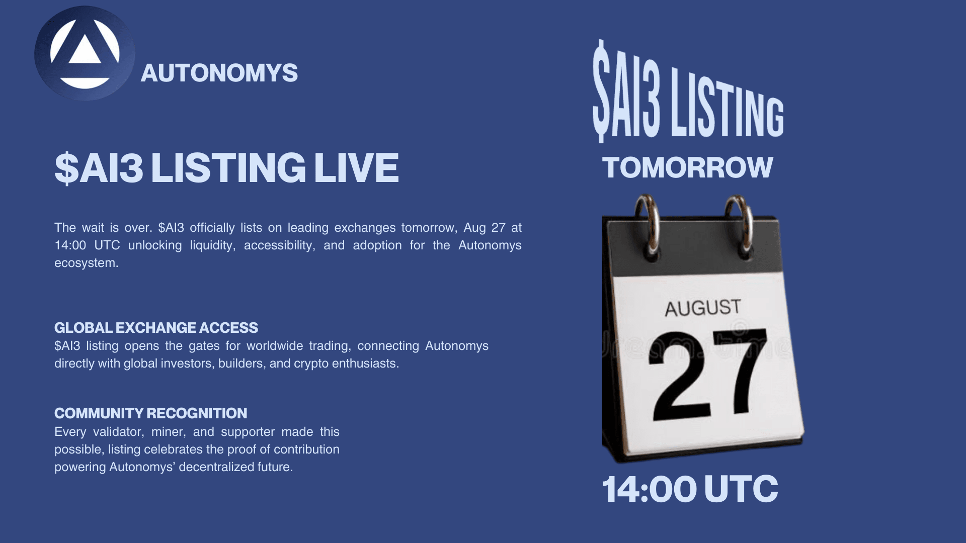 🚀 La quotazione di domani segna l'inizio di un viaggio in cui la comunità assume il centro della scena. Con ogni traguardo, Autonomys continua a dimostrare il proprio impegno a costruire l'infrastruttura Web3 più robusta alimentata da AI3 esistente.