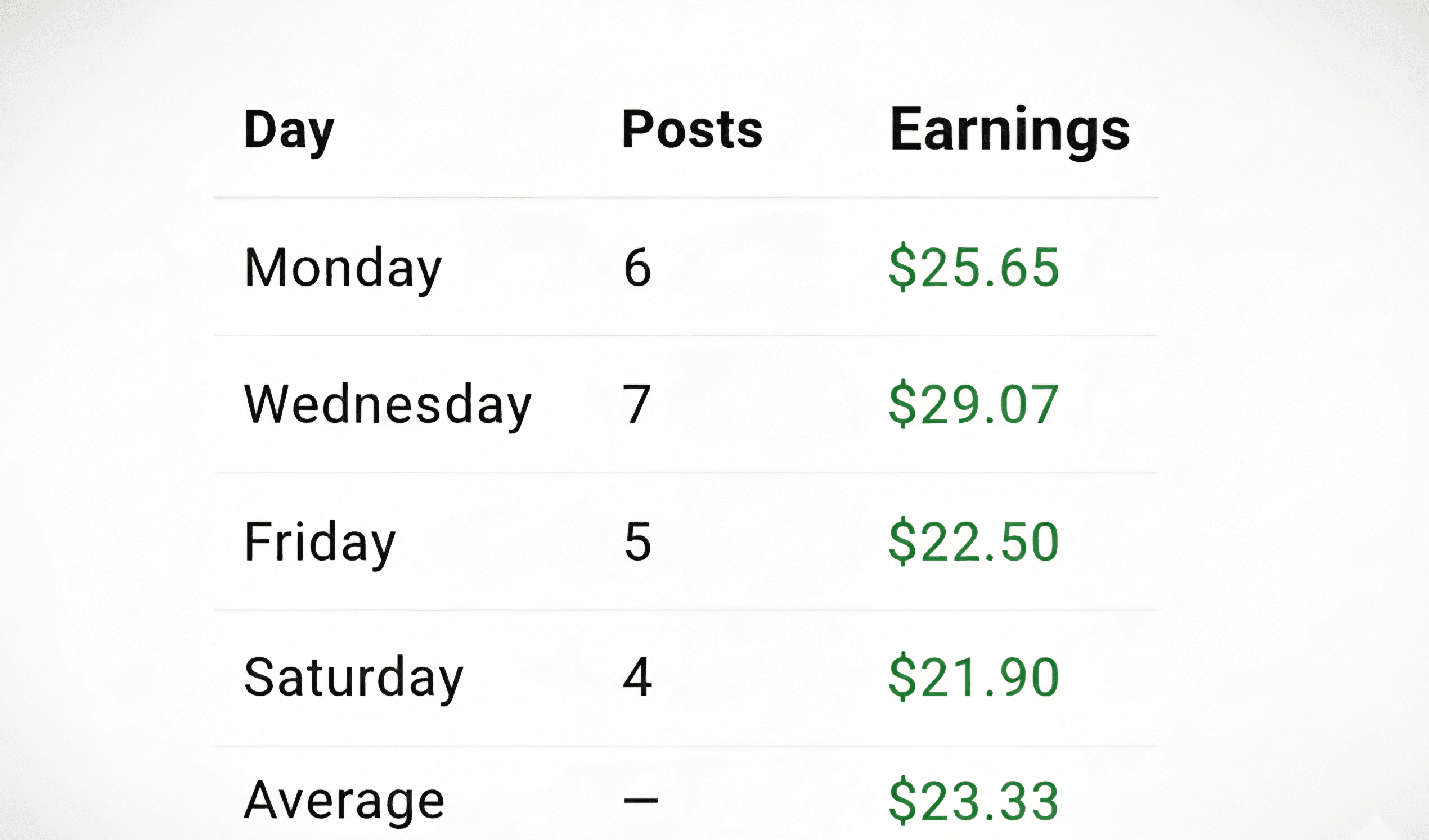 Pubblicare circa 4 a 6 buoni post al giorno può garantirti buoni guadagni. Se ogni post riceve una buona interazione, puoi guadagnare da 3 a 4 dollari per post, il che ti porterà facilmente a circa 20 dollari al giorno.