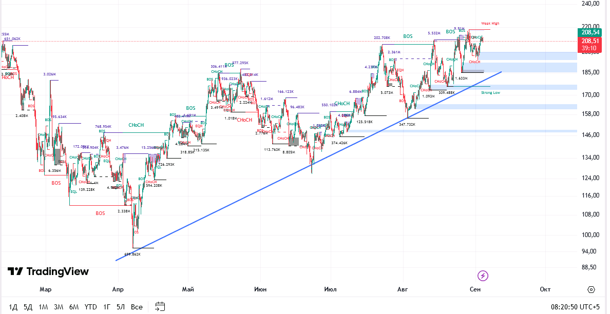 L'obiettivo più vicino è mantenersi sopra il supporto crescente e superare i livelli di resistenza a $225-240. Una rottura riuscita di questi livelli confermerà previsioni più ottimistiche.