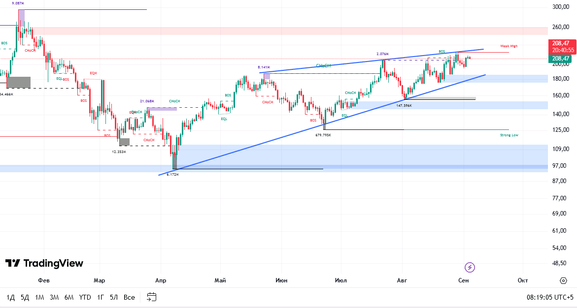 L'analisi tecnica mostra che il prezzo di SOL si mantiene sopra la chiave linea di supporto crescente nella fascia $190-200. Questo crea una base per una ulteriore crescita con obiettivi previsti tra $225-291 nei prossimi mesi.