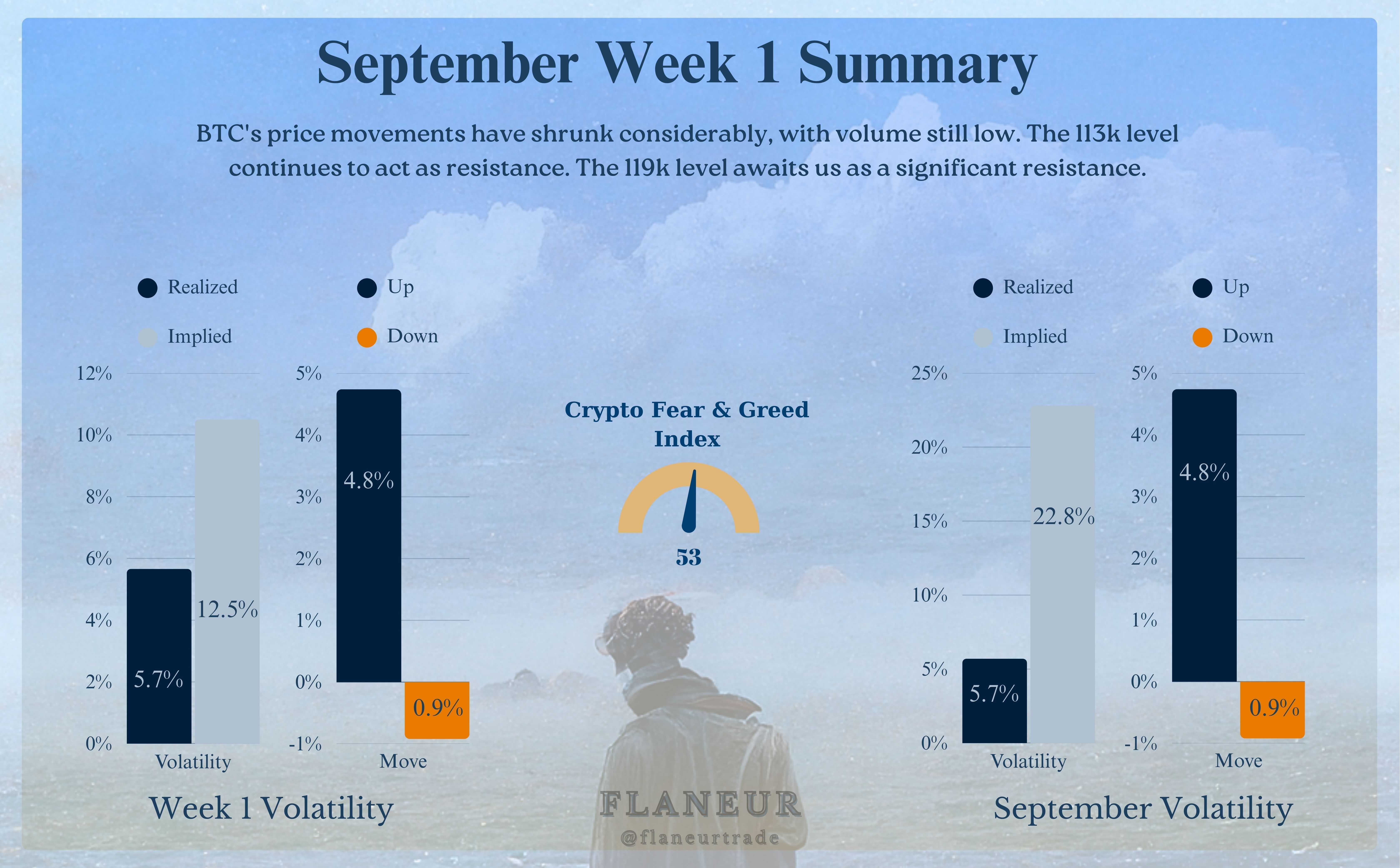 BTC ha chiuso la settimana scorsa con un aumento del +2.66%. Nonostante diversi tentativi durante la settimana, non è riuscito a rompere il livello di $113,000 che si ergeva come una fortezza contro di esso. Iniziare la settimana testando nuovamente questa zona critica mostra che gli acquirenti non si sono arresi, ma dimostra anche quanto siano forti i venditori. L'Indice di Paura e Avidità nel mercato è a 53, indicando indecisione neutra.
