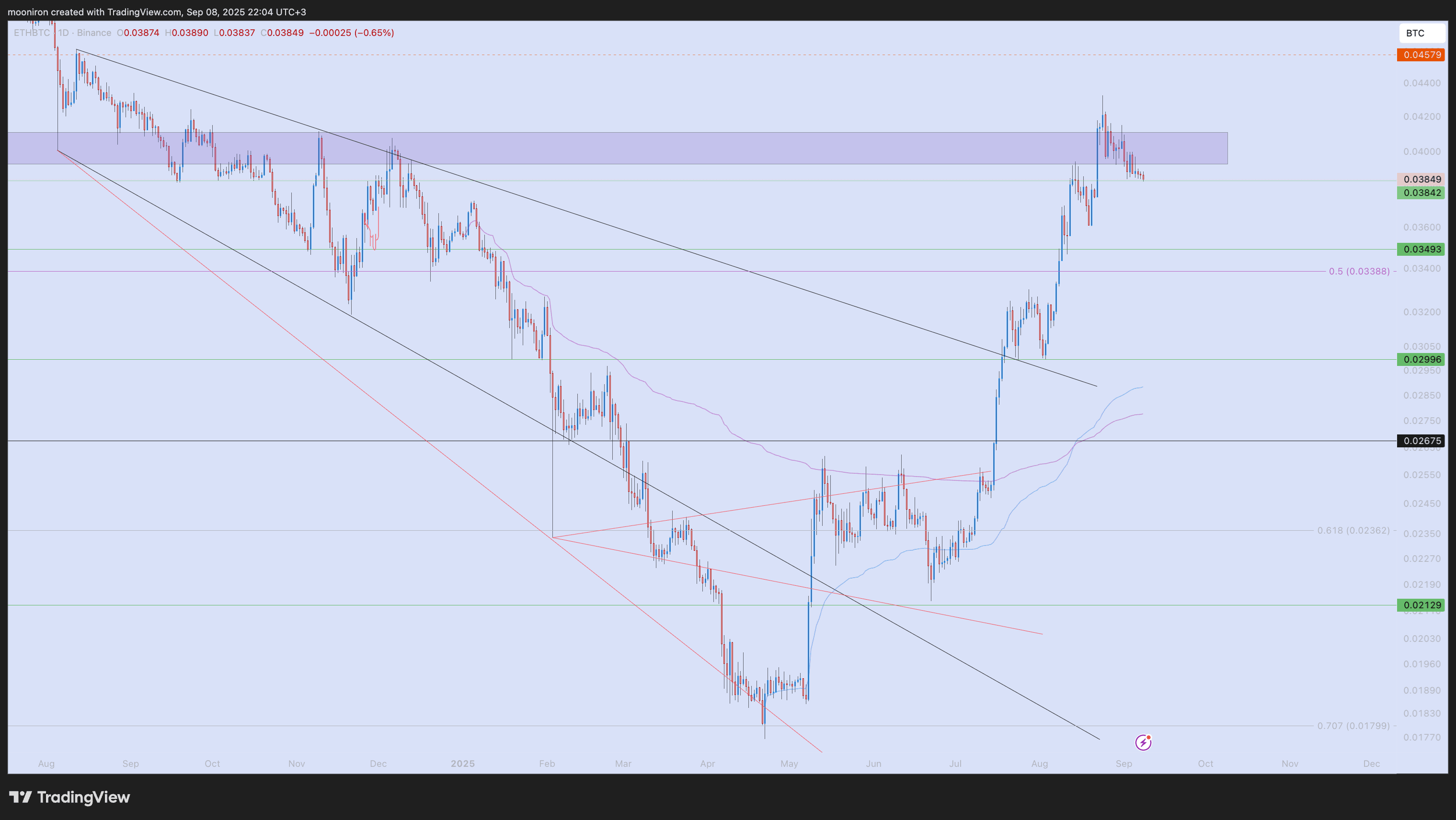 La settimana scorsa, con ETH che perdeva slancio contro BTC, c'è stato un certo ribasso nella coppia. Perché ETH riacquisti forza, deve prima rompere decisamente la resistenza di $4,500 nella sua coppia in Dollari. Fino a quando ciò non accade, ci si può aspettare che la coppia rimanga sotto pressione per un po'. Soprattutto dopo aver subito un forte aumento, perdere il supporto importante della scatola viola qui rende un ribasso verso l'area 0.033-0.034 possibile. Prendere posizioni short su ETH e long su BTC potrebbe essere più logico.