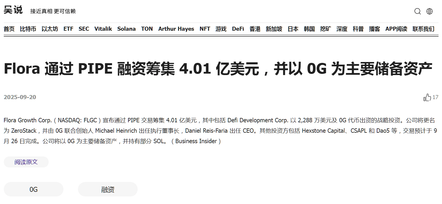 Da una prospettiva più ampia, la trasformazione di Flora Growth e la creazione del DAT hanno portato molteplici significati per 0G: in primo luogo, hanno creato una narrativa scarsa per la pianificazione anticipata delle istituzioni; in secondo luogo, attraverso il percorso di conformità NASDAQ, hanno fornito agli investitori istituzionali un canale di accesso al mondo dell'AI decentralizzata; e, cosa più importante, 0G è stato classificato accanto a Solana, posizionandosi come “la Solana nel campo delle infrastrutture AI”, il che non solo riconosce la sua posizione tecnologica, ma prelude anche a un enorme potenziale di aumento della valutazione.