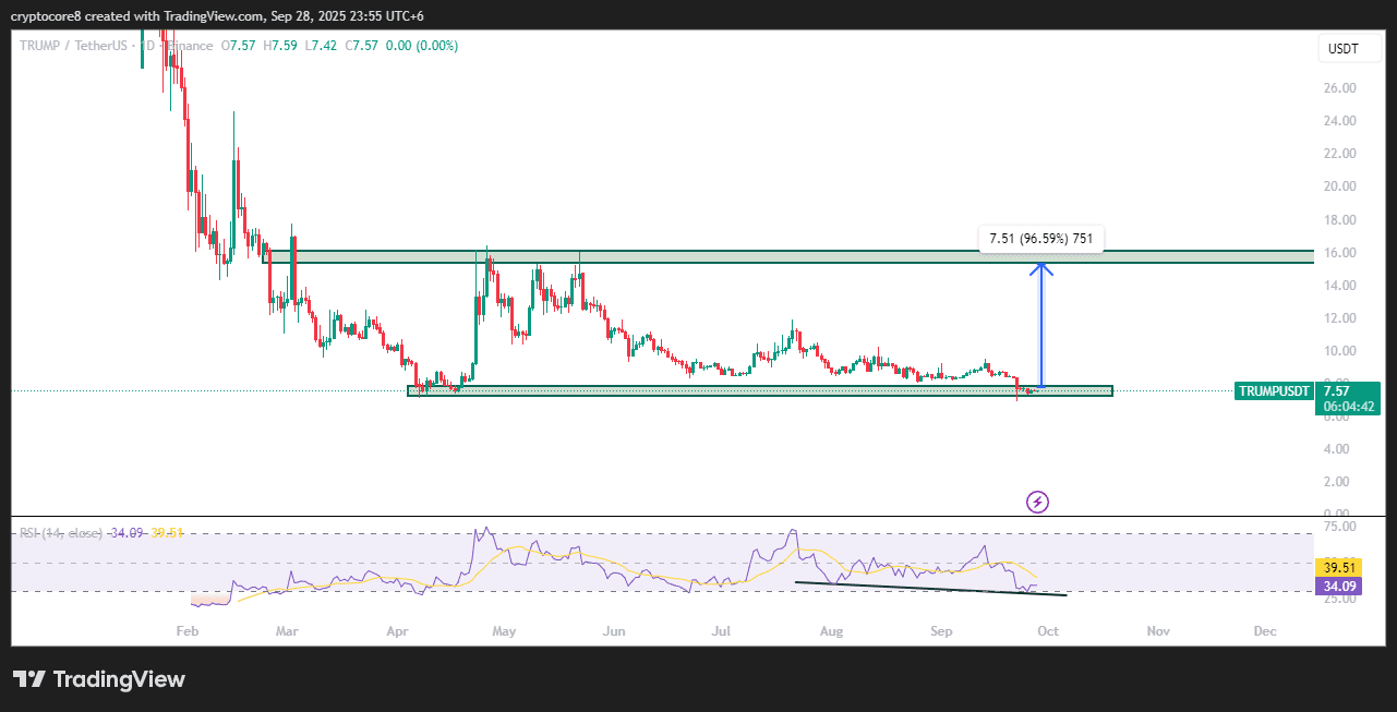 Questo grafico TRUMPUSDT mostra il prezzo che si mantiene forte nella zona di supporto con una divergenza rialzista sull'RSI. La freccia blu segnala un possibile aumento verso l'area di resistenza, quasi raddoppiando di valore, suggerendo un forte movimento rialzista in arrivo.