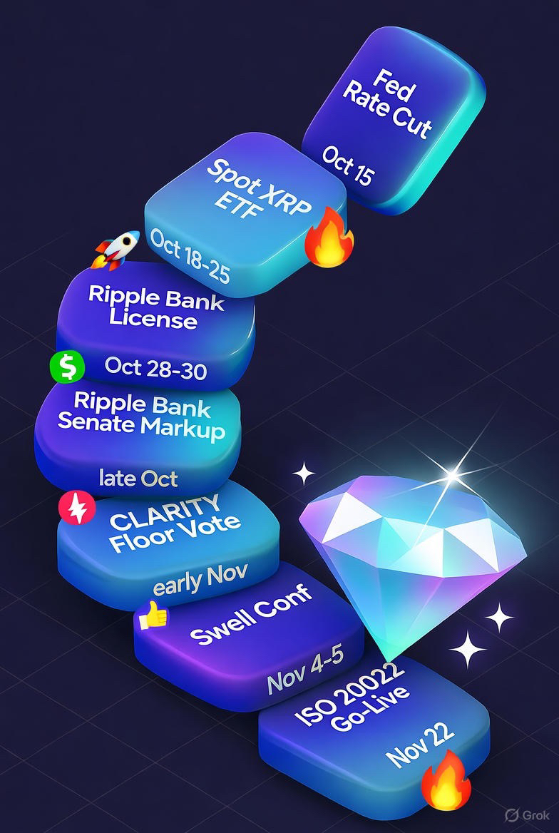 28-30 ottobre – La domanda di charter per la banca di fiducia nazionale di Ripple (presentata a luglio 2025) entra in una finestra di revisione chiave. L'approvazione potrebbe supercaricare il gioco istituzionale di XRP. (Tempistica della decisione: Fine 2025/inizio 2026.)