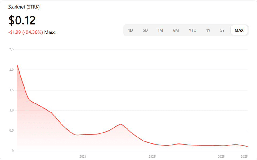 Dalla sua debutto, il token STRK ha subito un enorme calo del 95% dal suo picco.