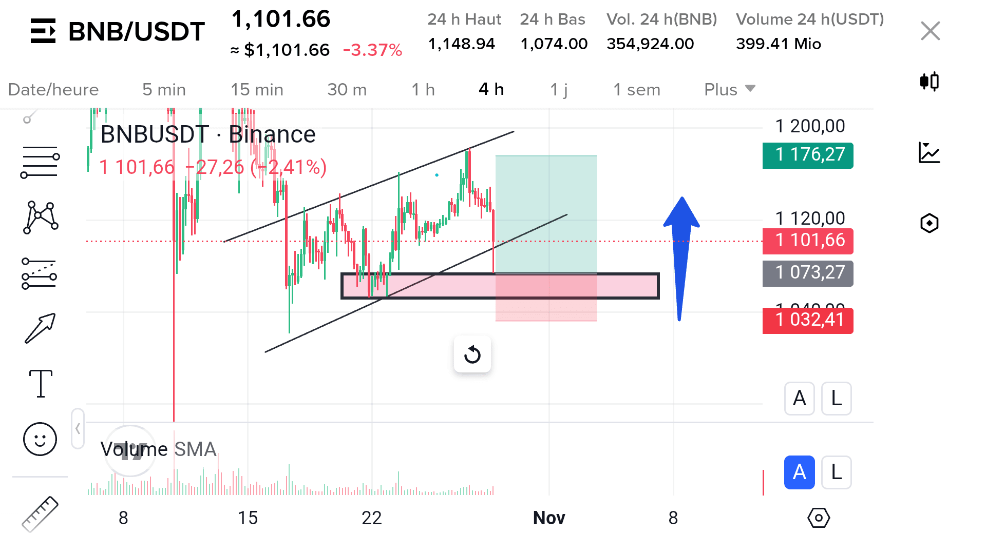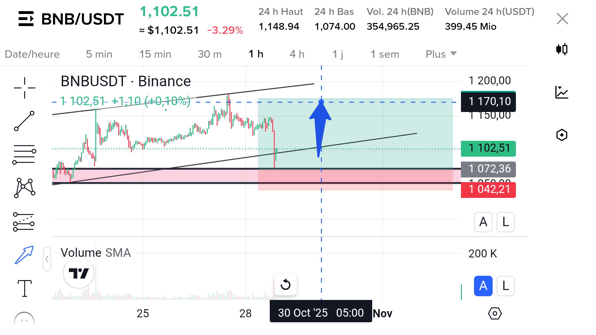 Sul grafico, il BNB/USDT si muove all'interno di un canale rialzista (visibile nelle unità 1h e 4h).