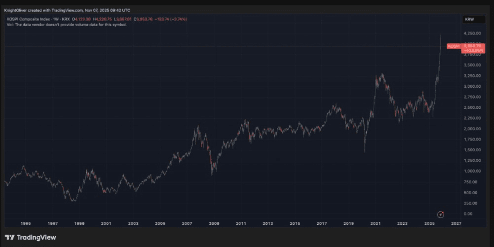 Perché mentre la cripto si raffreddava, la febbre non è svanita: è migrata. Lo stesso spirito di trading ad alta velocità e ad alto rischio ha trovato un nuovo campo di gioco: il mercato azionario coreano. L'indice KOSPI, il benchmark della Corea del Sud, è esploso nel 2025, aumentando di oltre il 70% dall'inizio dell'anno. Solo a ottobre, ha registrato un guadagno straordinario del 21%, il suo miglior mese in quasi un quarto di secolo, stabilendo 17 record intraday. E al centro di questa euforia si trovano i giganti dei semiconduttori del paese: Samsung Electronics e SK hynix, la cui dominanza nel settore della memoria ad alta larghezza di banda li ha trasformati nei darlings di una nazione dipendente dall'AI.