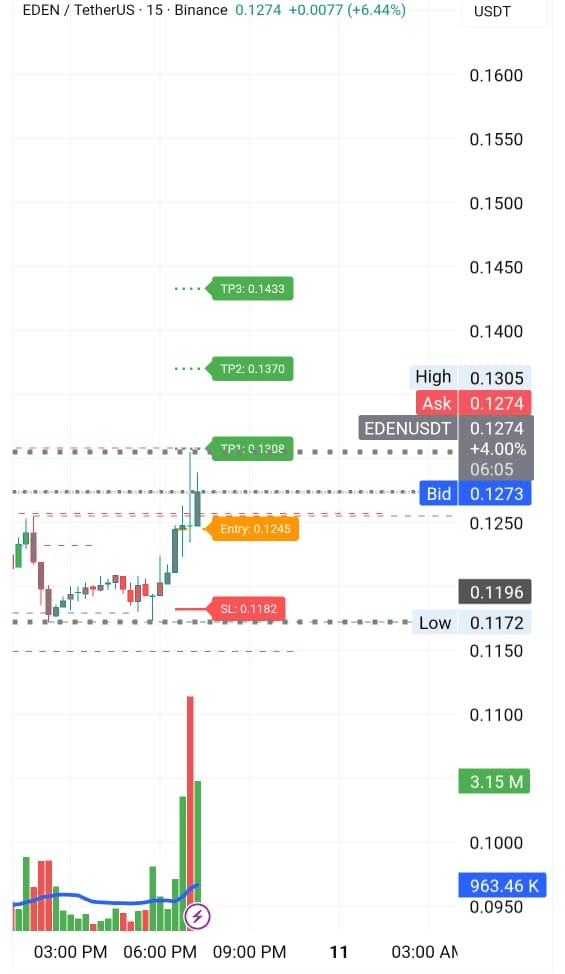 EDEN ha mostrato un solido movimento rialzista nelle ultime sessioni, guadagnando slancio dopo aver testato la zona di supporto inferiore. Il prezzo si sta ora consolidando vicino a 0.1274, offrendo un'opportunità di trading a breve termine con livelli chiari per l'entrata e il controllo del rischio.