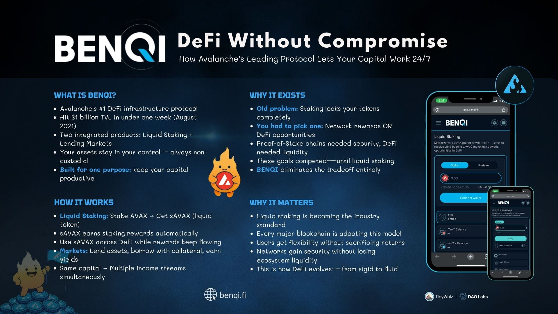 Costruito su #Avalanche infrastrutture ad alte prestazioni, BENQI opera come una suite di protocolli DeFi progettati attorno a un principio fondamentale: i tuoi beni dovrebbero sempre lavorare. La piattaforma combina due prodotti principali—BENQI Liquid Staking e BENQI Markets—per creare un ecosistema in cui la liquidità fluisce liberamente generando più flussi di reddito.
